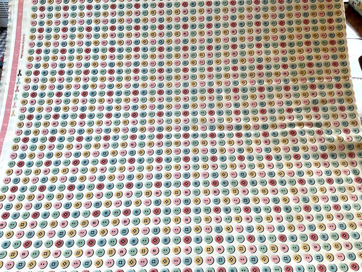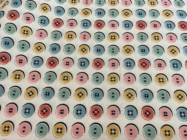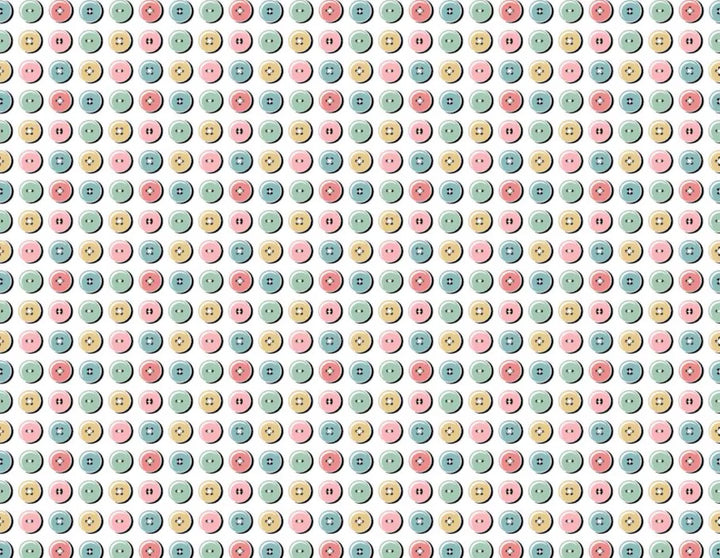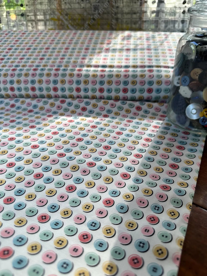 ¡Viaja en el tiempo con este diseño vintage! La tela Granny's Sewing Room de Poppie Cotton presenta un encantador estampado de botones multicolores en tonos rosa, amarillo, verde y azul sobre un fondo blanco nítido . Este diseño juguetón y lleno de nostalgia es perfecto para proyectos de costura con inspiración vintage, ideal para accesorios de costura, ropa infantil y decoración del hogar con un toque único .