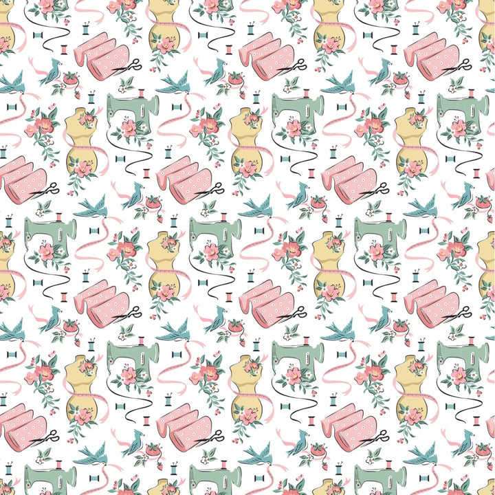 1/2 metro de Algodón Máquinas de Coser, Maniquí y Tela sobre Blanco El Cuarto de Costura de la Abuela Llega el 31 de octubre