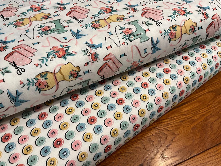 ¡Viaja en el tiempo con este diseño vintage! La tela Granny's Sewing Room de Poppie Cotton presenta un encantador estampado de botones multicolores en tonos rosa, amarillo, verde y azul sobre un fondo blanco nítido . Este diseño juguetón y lleno de nostalgia es perfecto para proyectos de costura con inspiración vintage, ideal para accesorios de costura, ropa infantil y decoración del hogar con un toque único .