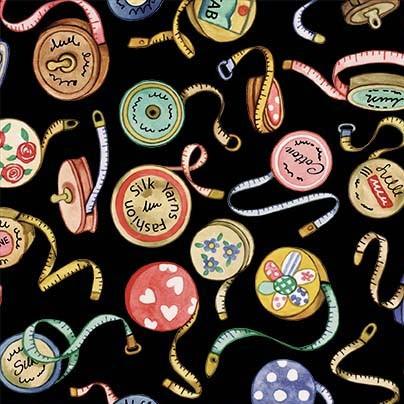¡Celebra tu pasión por la costura! Nuestra tela Sew Pretty presenta un diseño exclusivo con instrumentos de medición y herramientas de costura sobre elegante fondo negro. Perfecta para proyectos que reflejen tu amor por el arte textil.