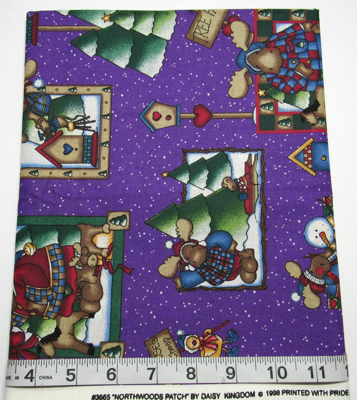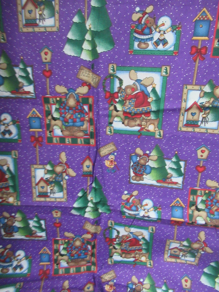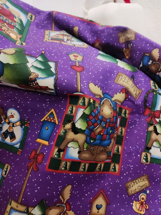 1/2 metro de tela de algodón Renos y Hombres de Nieve en púrpura vintage