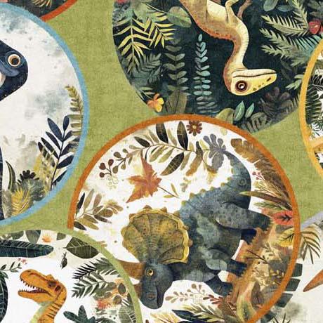 1/2 metro de Tela de algodón Viñetas redondas de Dinosaurios en verde QT *Llega el 17 nov*
