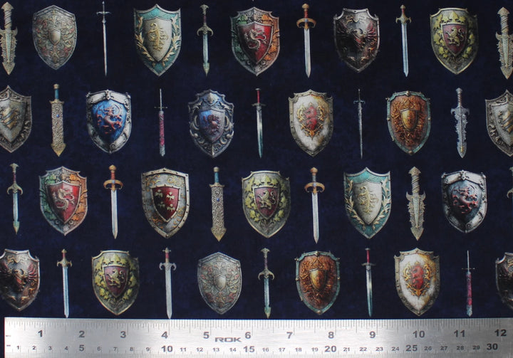 Sumérgete en un mundo de fantasía con esta tela de algodón que muestra escudos y espadas sobre un fondo azul marino profundo. Ideal para proyectos que buscan un toque medieval o de caballería, sus diseños detallados aportan un estilo elegante y lleno de carácter. Con un ancho de 110 cm y 100% algodón, esta tela es la elección perfecta para crear piezas con personalidad y distinción.