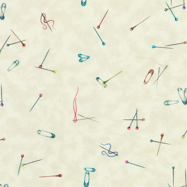 ¡Captura la esencia más delicada de la costura! La exquisita tela Robert Kaufman "Make It Sew" presenta un diseño vintage minimalista donde agujas con hilo y alfileres se desplazan elegantemente sobre un sofisticado fondo crema. Un tributo a los pequeños instrumentos que hacen posible el arte textil.