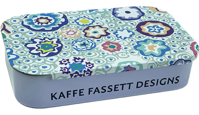 Una hermosa lata coleccionable con el diseño exclusivo "Millifiore" de Kaffe Fassett, perfecta para guardar tus accesorios de costura y agregar un toque de arte a tu espacio de trabajo.