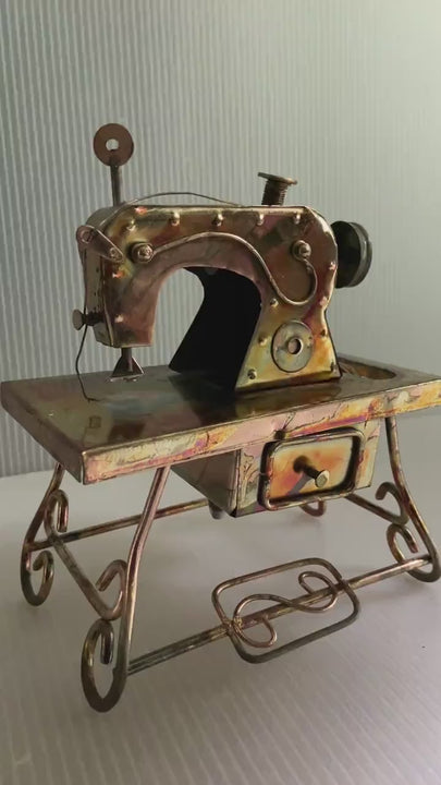 Lo más fascinante de esta pieza es su mecanismo sincronizado: al darle cuerda y abrir el cajón, la música comienza a sonar y la máquina inicia su movimiento. Podrás observar cómo el pedal sube y baja, la rueda gira y la aguja simula el acto de coser, transportándote instantáneamente a los talleres de costura de nuestras abuelas.