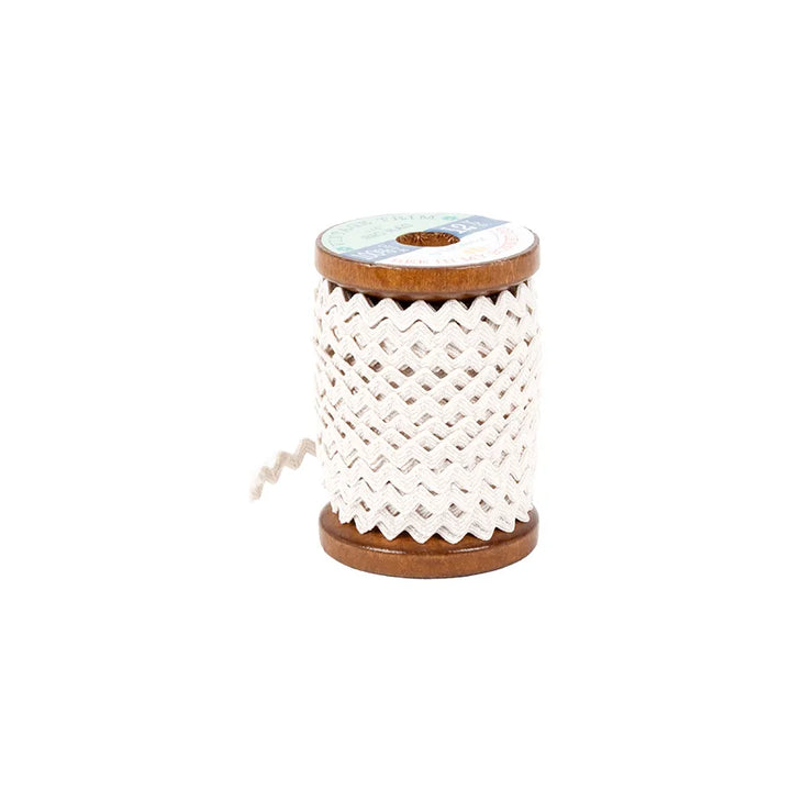 Cinta Ricrac Vintage Latte en Carrete de Madera Agrega un toque vintage auténtico a tus proyectos con esta hermosa cinta diseñada por Lori Holt de Bee In My Bonnet. Cada carrete de madera contiene 12 yardas de cinta de 0.25" de ancho, perfecta para adornar quilts, almohadas, bolsas y más. Su color latte neutro combina con cualquier paleta de colores. Ideal para costureras y artesanas que buscan detalles especiales en sus creaciones.