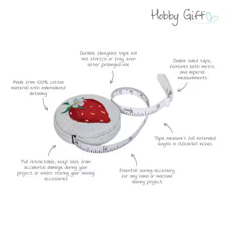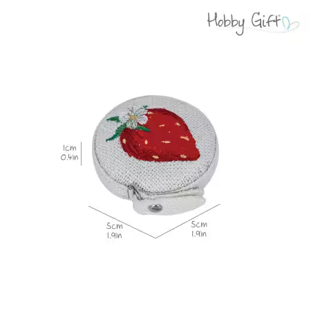 Cinta métrica retráctil de 60 pulgadas con encantador diseño de fresas bordadas. Elaborada en algodón 100% con detalles bordados de fresas rojas vibrantes, hojas verdes y delicada flor blanca sobre tela texturizada. La cinta de fibra de vidrio se extiende hasta 150cm con medidas precisas en centímetros e pulgadas en ambos lados. Mecanismo completamente retráctil que protege la cinta de daños accidentales, evitando estiramientos y deshilachado. Perfecta para costura a mano o máquina, combina funcionalidad con estilo adorable.