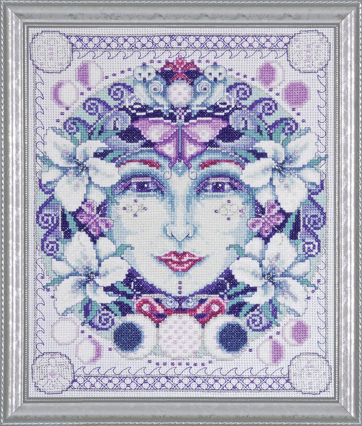 Kit de punto de cruz con diseño lunar creado por la reconocida diseñadora Joan Elliott. Este kit completo incluye tela Aida de algodón 100% con 14 puntos, hilos de bordar presurtidos, cuentas decorativas, aguja e instrucciones detalladas.