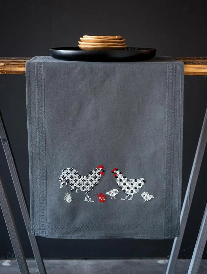 Kit de punto de cruz estampado "Gallo y Gallina" de Vervaco. Este encantador camino de mesa presenta un diseño rústico con gallos, gallinas y pollitos en tonos grises. Medidas: 16" x 40".