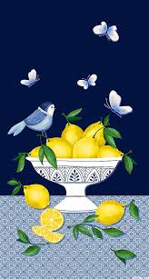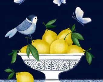 Panel de tela de algodón Fresco como un Limón en azul marino con pajarito, mariposas y talavera