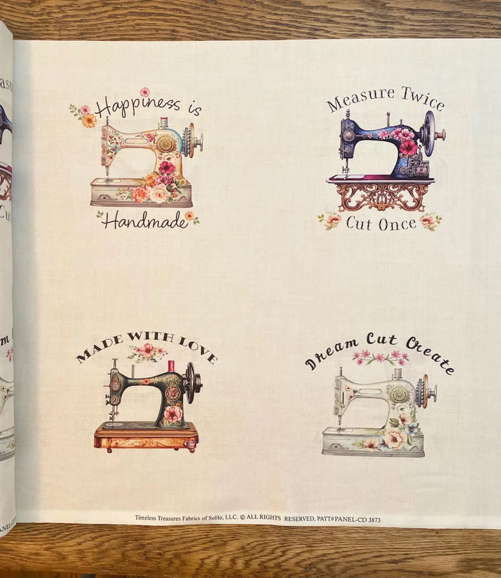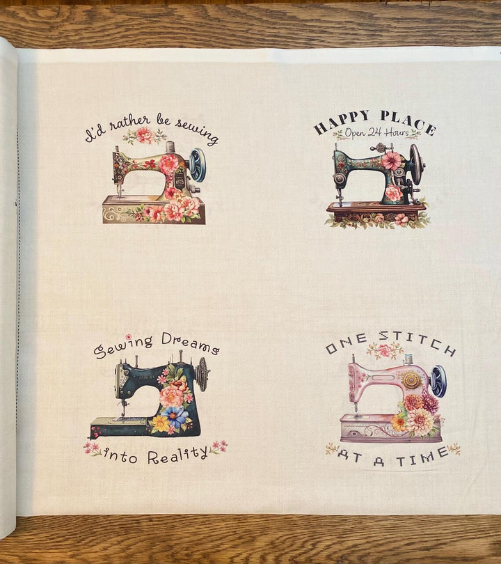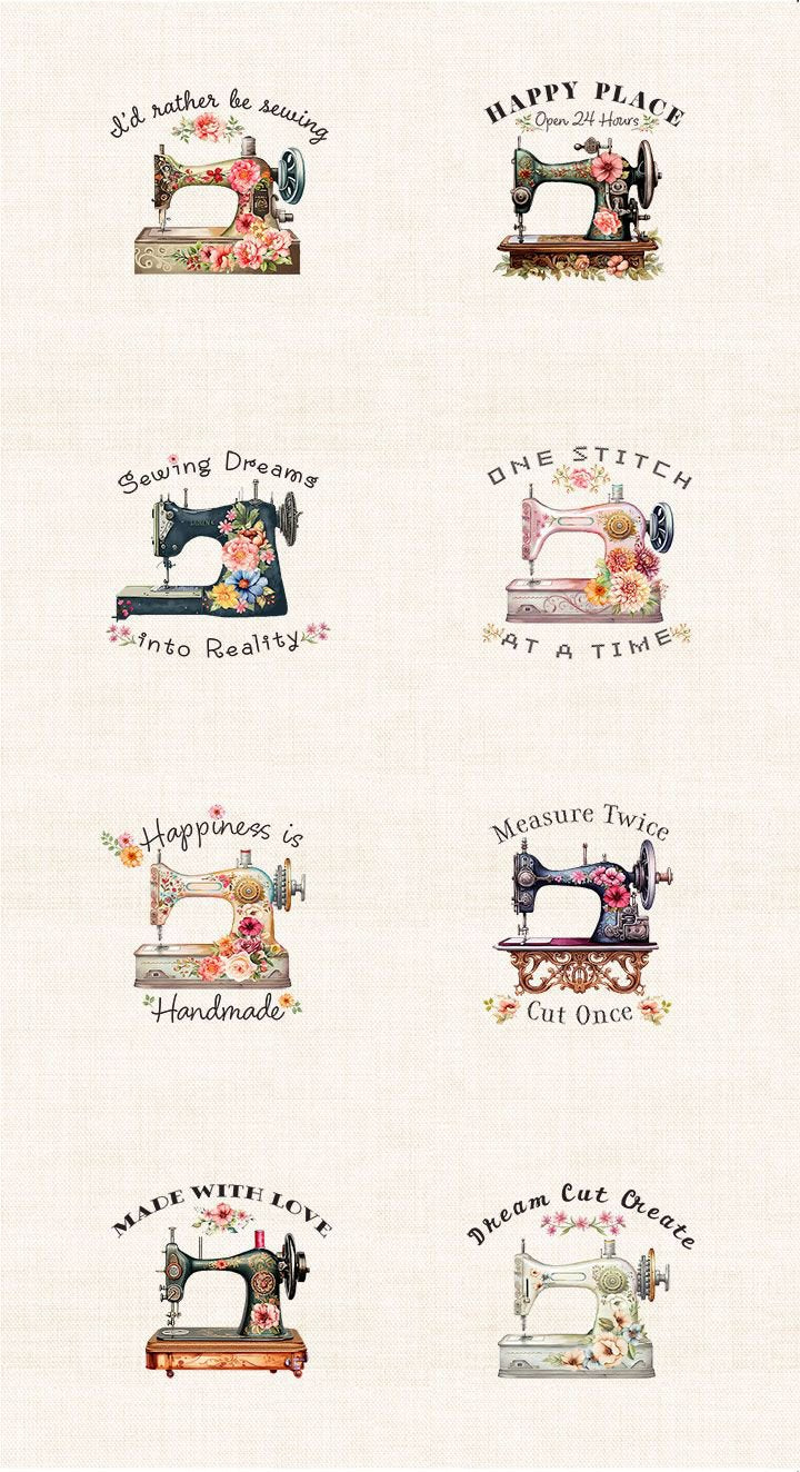 ¡Decora tu espacio creativo con este encantador panel! "Floral Sewing Machines" de la colección Happy Place by Timeless Treasures presenta un diseño vintage con máquinas de coser sobre un elegante fondo crema, rodeado de delicadas flores. Perfecto para proyectos de quilting que celebran tu pasión por la costura.