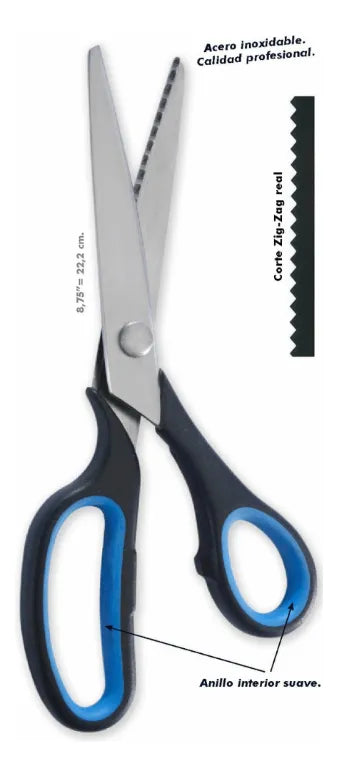 Tijeras profesionales de acero inoxidable diseñadas especialmente para cortar tela con precisión. Con una longitud de 8.75 pulgadas (22.2 cm), estas tijeras cuentan con hojas en zigzag que evitan que la tela se deshilache y se separe. Ideales para sastres, costureras y aficionados al patchwork. El acero de calidad garantiza durabilidad y un corte limpio en cada uso. Perfectas para proyectos de costura profesional o doméstica.