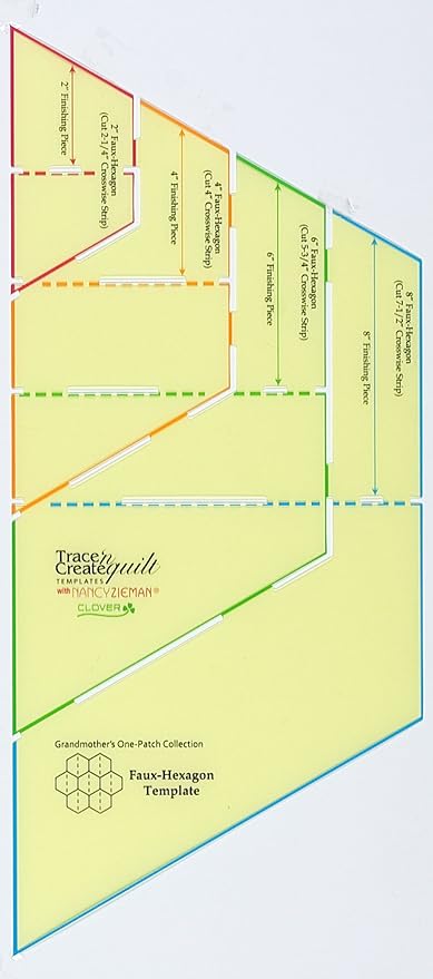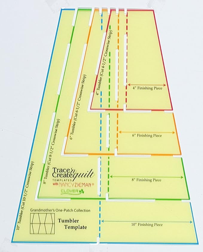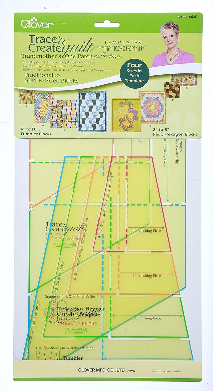 Plantilla Trace 'n Create de Clover para crear quilts espectaculares con un solo bloque. Incluye dos plantillas versátiles: una para bloques tumbler (de 4 a 10 pulgadas) y otra para bloques hexágonos falsos (de 2 a 8 pulgadas). Perfecta para quilters de todos los niveles, te permite diseñar desde bloques tradicionales hasta versiones extra grandes. Parte de la colección Grandmother's One Patch, esta herramienta facilita el trazado preciso y el corte exacto para resultados profesionales en cada proyecto.